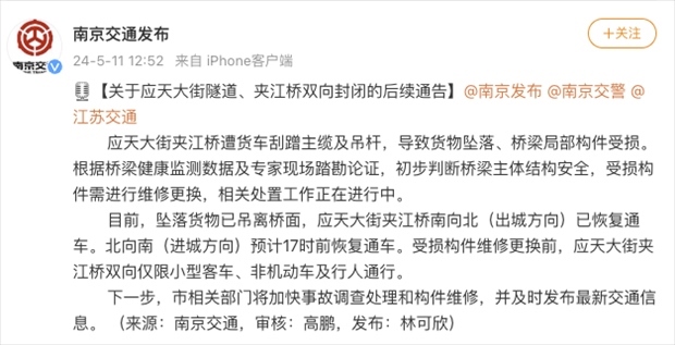 ·南京貨車側(cè)翻撞壞夾江大橋?官方通報(bào):初步判斷橋梁主體結(jié)構(gòu)安全。