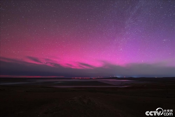 5月11日凌晨,隨著太陽強(qiáng)耀斑的再次爆發(fā),內(nèi)蒙古錫林浩特市上空出現(xiàn)絢麗的洋紅色極光。