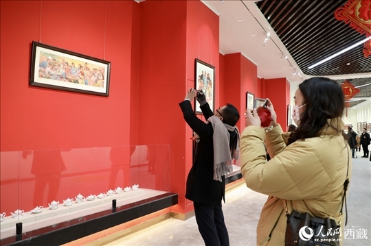 觀眾欣賞由西藏自治區(qū)延安精神研究會(huì)主辦的“紅色記憶”中國年畫展。人民網(wǎng)記者 次仁羅布攝