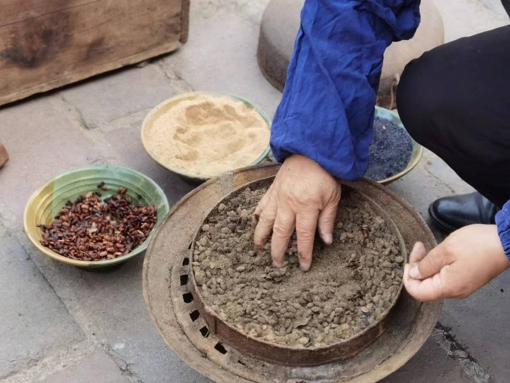 沖好針孔,便在磨石上反復(fù)銼尖。隨后倒入熱鍋里翻炒,再舀入一瓢水,針的剛性和硬度由此增加。接下來(lái)便輪到三大碗“大陽(yáng)秘方”登場(chǎng):白崖土粉末、松木炭和發(fā)酵后的豆豉,用于蒸針?!八赡咎靠梢栽黾愉撫樀暮剂浚嵘捕?;豆豉增加亮度;白崖土粉末作為分散劑讓針受熱均勻。這樣處理后可以保證針質(zhì)更堅(jiān)硬又有光澤?!?/p>