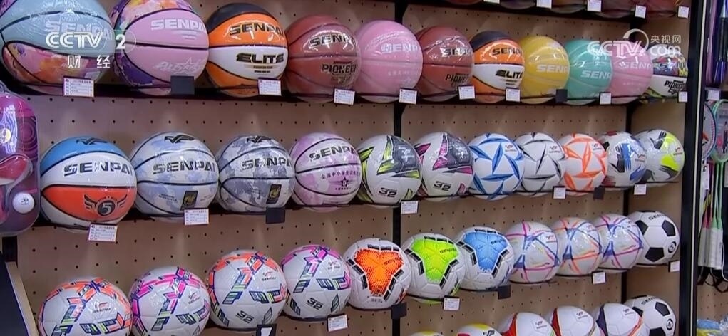 這里是義烏國際商貿城三區(qū),擺滿了各種體育用品。記者了解到,最近籃球、足球、排球等體育用品訂單猛漲。