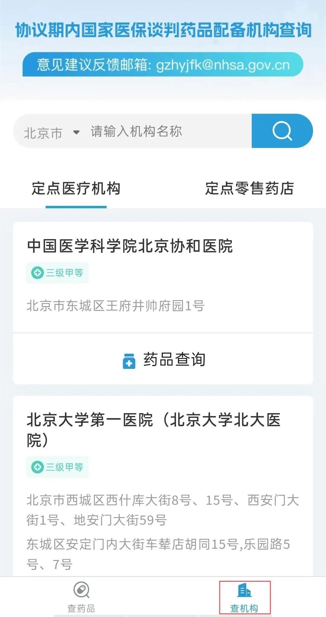 同時(shí),您也可以點(diǎn)擊頁(yè)面下方“查機(jī)構(gòu)”,進(jìn)入“定點(diǎn)醫(yī)療機(jī)構(gòu)”或“定點(diǎn)零售藥店”頁(yè)面,確定具體的醫(yī)療機(jī)構(gòu)或零售藥店后,點(diǎn)擊“藥品查詢(xún)”,了解該機(jī)構(gòu)配備的全部“國(guó)談藥”情況,如下圖所示。