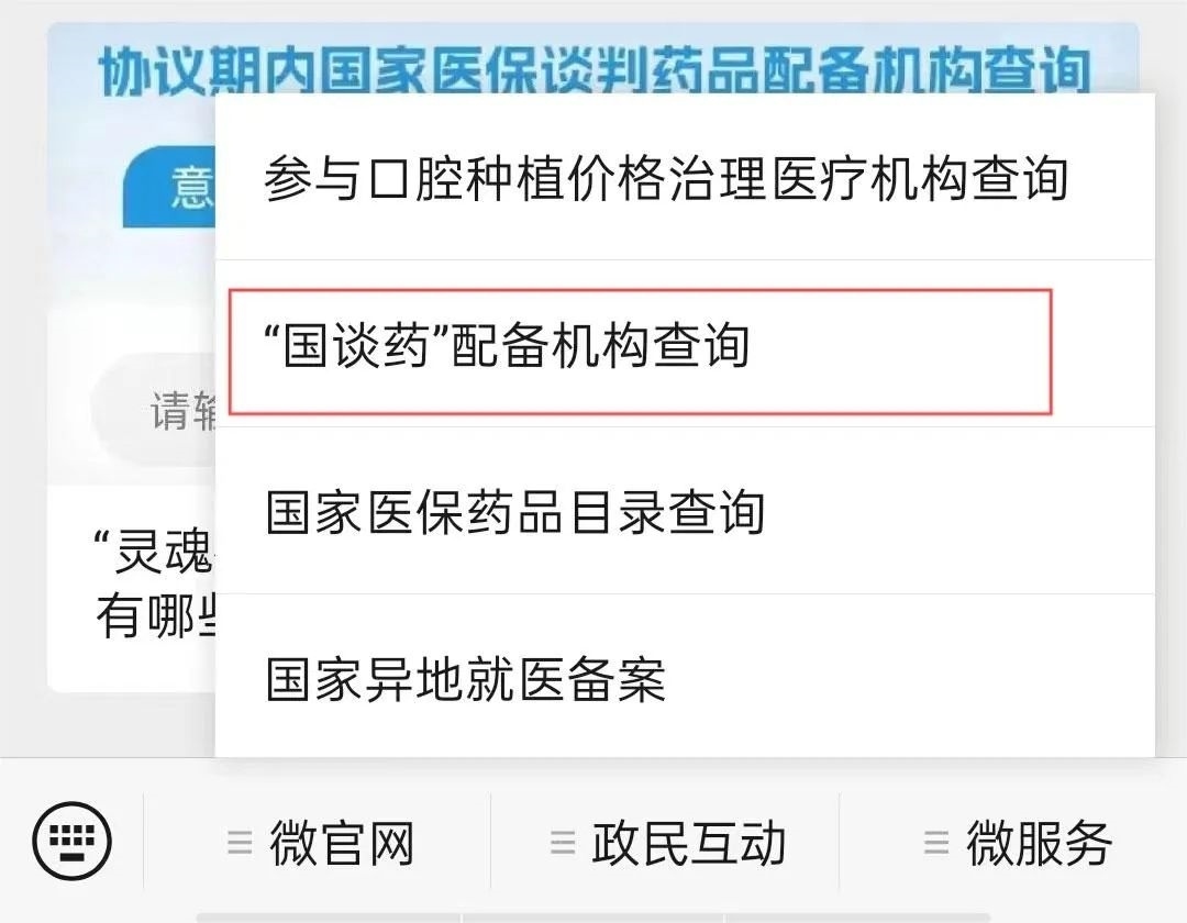 第一步:進(jìn)入“國(guó)家醫(yī)保局”微信公眾號(hào),點(diǎn)擊微服務(wù)→“國(guó)談藥”配備機(jī)構(gòu)查詢(xún),進(jìn)入查詢(xún)頁(yè)面。