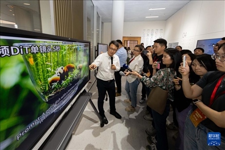 ?5月23日,大模型企業(yè)、智象未來生態(tài)合作部總經(jīng)理沈偉峰為采訪團介紹運用大模型文生視頻。新華社記者 王翔 攝