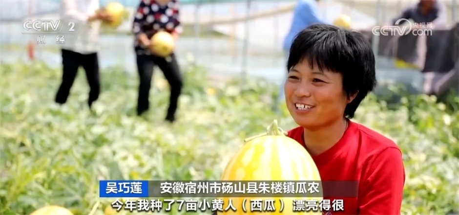 安徽碭山縣朱樓鎮(zhèn)瓜農(nóng)吳巧蓮介紹:“今年我種了7畝小黃人西瓜,漂亮得很,產(chǎn)量在8000斤左右,價(jià)格每斤3元左右,比普通的瓜一斤貴一元多。這個(gè)瓜賣(mài)30多元一個(gè)?!?/p>