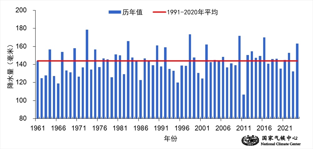 圖3 1961-2024年春季全國平均降水量歷年變化(單位:毫米)