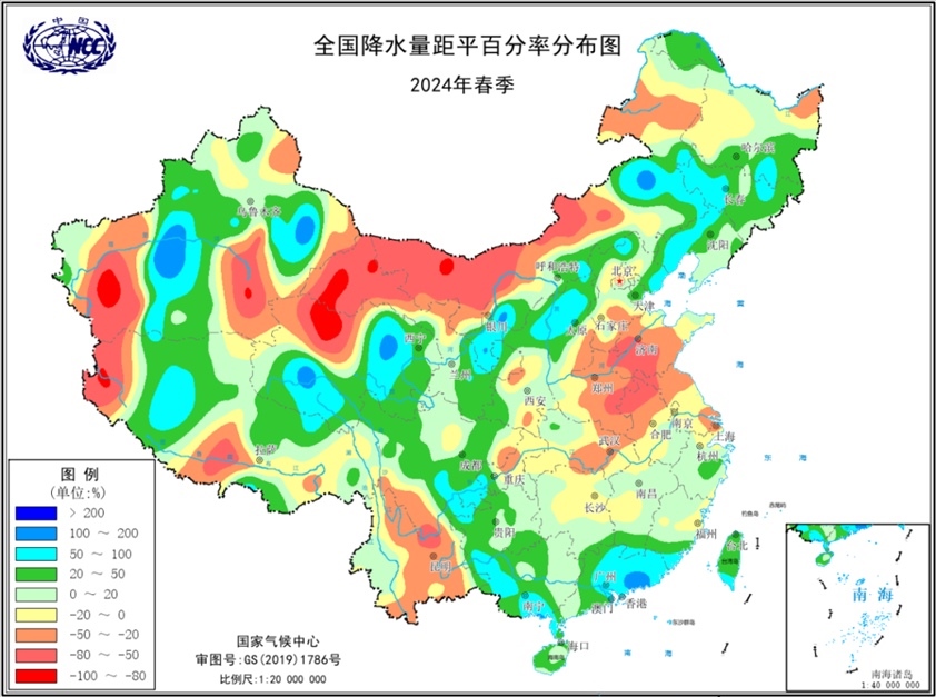 央視網(wǎng)消息:2024年春季,全國氣候總體呈現(xiàn)暖濕特征。平均氣溫為歷史同期最高,南方多站日最高氣溫達(dá)到或超過歷史極值;北方冷空氣次數(shù)偏多,氣溫波動起伏大。全國降水量總體偏多,但空間分布不均。14次區(qū)域暴雨過程襲擊我國,較常年同期明顯偏多;南方強對流天氣頻發(fā),局地影響重;西南地區(qū)出現(xiàn)冬春連旱,進(jìn)入5月后緩解;4月以來,黃淮江淮地區(qū)氣象干旱露頭并發(fā)展,目前仍存在中度及以上等級氣象干旱;春季,西北太平洋及南海共生成兩個臺風(fēng),生成數(shù)量接近常年同期,無臺風(fēng)登陸我國。