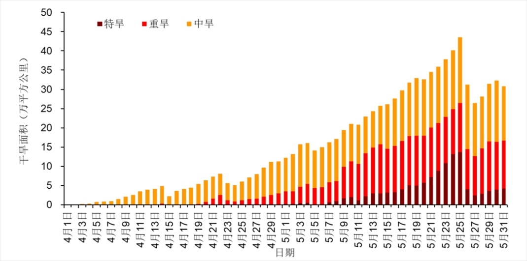 西南地區(qū)冬春連旱緩解,黃淮江淮干旱露頭發(fā)展。今年以來由于溫高雨少,我國西南地區(qū)出現(xiàn)冬春連旱,4月17日重旱及以上面積(32.6萬平方公里)、特旱面積(13萬平方公里)達(dá)到峰值。進(jìn)入5月后出現(xiàn)多次降水過程,冬春連旱緩解。4月以來,黃淮、江淮等地氣象干旱開始露頭并發(fā)展。至5月25日,中旱及以上等級干旱面積(43.6萬平方公里)和特旱面積(13.7萬平方公里)均達(dá)最大(圖6)。目前,黃淮中部、江淮北部、江漢東部等地仍存在中度及以上等級氣象干旱。5月31日,魯豫皖蘇鄂五省中旱以上干旱面積30.8萬平方公里,其中重旱12.4萬平方公里,特旱4.3萬平方公里(圖7)。