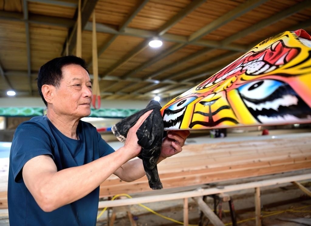 2024年6月3日,福州市非物質(zhì)文化遺產(chǎn)“方莊龍舟制造技藝(閩侯縣)”的傳承人方紹晃在擦拭準(zhǔn)備交付的龍舟船頭。方莊村是福建遠近聞名的“龍舟村”,制造龍舟的技藝已傳承了700多年,每年有200余艘傳統(tǒng)龍舟銷往全國及海外。方紹晃介紹說,制作一艘福州傳統(tǒng)龍舟從原料選擇到制作都非常講究,主要選取閩北山區(qū)樹齡40年以上的杉木和樟木為原材料,歷經(jīng)做龍骨、釘?shù)装濉⒀b魚梁、拋光、畫花、上油漆等多道工序,最后裝上精心雕刻的龍頭才算大功告成。