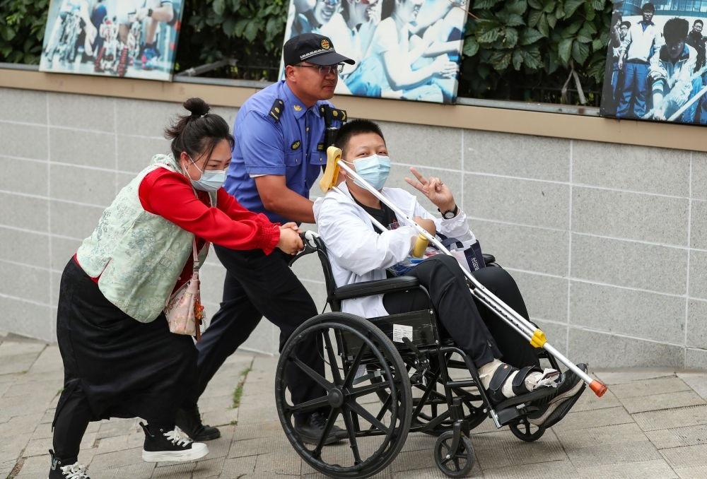 ↑6月7日,一位行動不便的考生在家人和沈陽市城市管理綜合行政執(zhí)法局工作人員的幫助下抵達(dá)沈陽市第五中學(xué)考點。