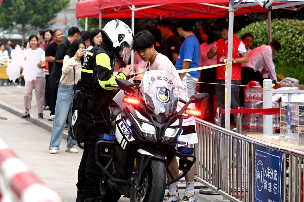 ↑6月7日,民警護送一名考生順利抵達(dá)安徽合肥市五十中學(xué)天鵝湖教育集團天鵝湖校區(qū)考點。
