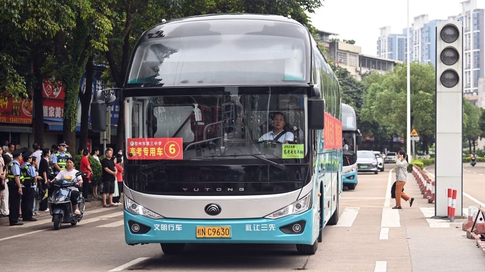 ↑6月7日,在廣西欽州市第二中學(xué)考點,高考專用車接送考生應(yīng)考。