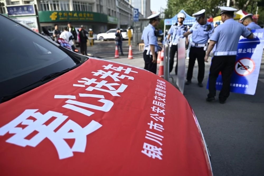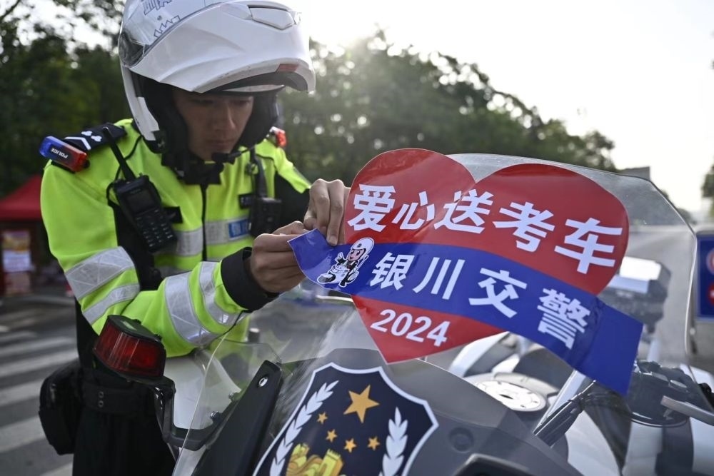 ↑6月7日,寧夏銀川市公安局交通警察分局興慶區(qū)交警一大隊民警在準(zhǔn)備愛心送考車輛。