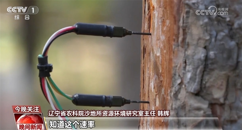 記者在采訪時(shí)看到,一棵樹的樹干上插了兩根探針,據(jù)遼寧省農(nóng)科院沙地所資源環(huán)境研究室主任韓輝介紹,這是用來監(jiān)測樹干水分的。通過監(jiān)測兩根探針之間的溫差,他們就能夠計(jì)算出這棵樹的液流速率。知道這個(gè)速率,他們就可以了解這棵樹的生長狀態(tài),這個(gè)實(shí)驗(yàn)的最終目的,是想得出在單位面積上到底有多少棵樟子松最合理。