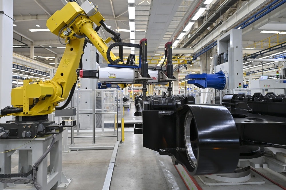 2024年4月9日,在山西太原太重集團(tuán)智能高端液壓挖掘機產(chǎn)業(yè)園區(qū),智能裝配機器人在智能生產(chǎn)線上作業(yè)。