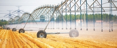 6月17日,在山東省東營市廣饒縣李鵲鎮(zhèn)前艾家村的田地里,農(nóng)民正在使用桁架式噴灌機(jī)澆地。劉云杰攝(人民視覺)