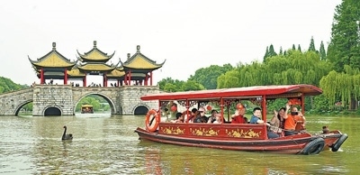 文旅融合市民和游客乘坐游船游覽揚州瘦西湖。本報記者 雷 聲攝