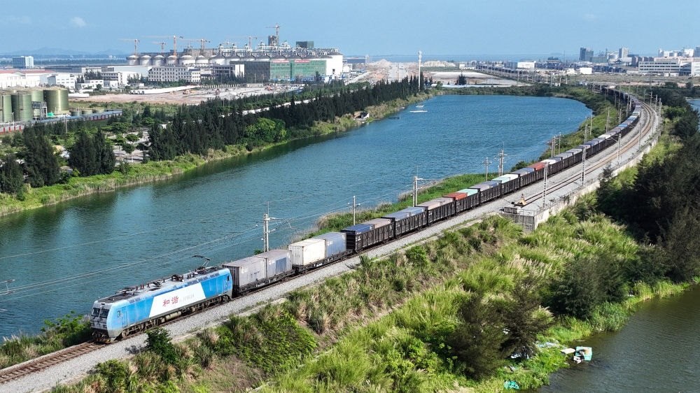 西部陸海新通道鐵海聯(lián)運(yùn)班列從欽州港東站駛出(2024年5月12日攝,無(wú)人機(jī)照片)。隨著中國(guó)-東盟開放平臺(tái)建設(shè)向縱深推進(jìn),西部陸海新通道正在成為釋放開放活力的強(qiáng)力新引擎,以物流為切入口,促進(jìn)資金、資源、人員、技術(shù)等生產(chǎn)要素深度融合。