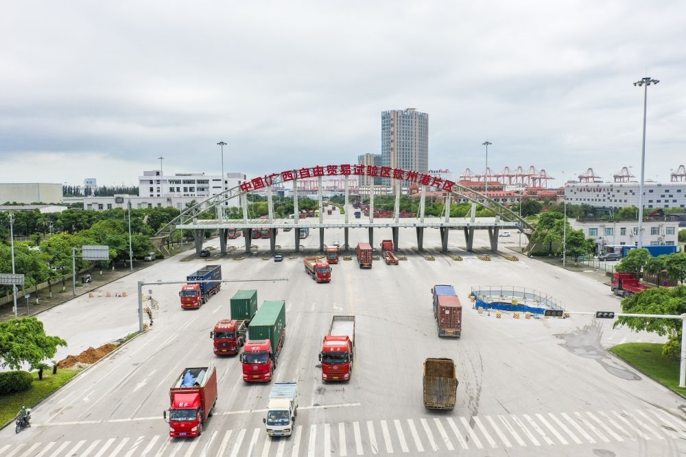 中國(guó)(廣西)自由貿(mào)易試驗(yàn)區(qū)欽州港片區(qū)(2024年5月20日攝,無(wú)人機(jī)照片)。聚焦面向東盟、服務(wù)陸海新通道、沿邊開放三大特色,開展差異化探索和特色制度創(chuàng)新,讓中國(guó)(廣西)自由貿(mào)易試驗(yàn)區(qū)成為我國(guó)面向東盟開放發(fā)展的前沿。