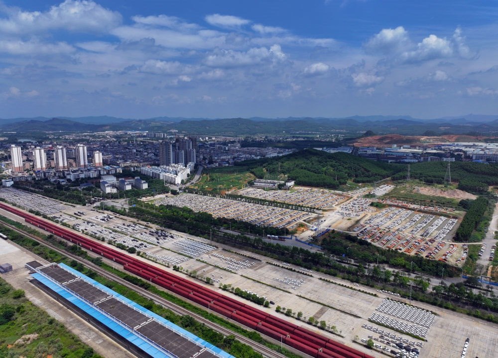 汽車在廣西柳州雒容汽車物流基地等待進(jìn)入鐵路貨車車廂。部分出口的新能源汽車從這里裝車運(yùn)往各大出海港口(2024年5月24日攝,無(wú)人機(jī)照片)。