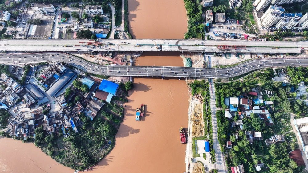 施工隊(duì)在廣西欽州市拆舊橋建新橋,疏浚平陸運(yùn)河流經(jīng)欽州市區(qū)的航道(2024年5月12日攝,無(wú)人機(jī)照片)。平陸運(yùn)河建成后將成為廣西及西南地區(qū)通往東盟地區(qū)運(yùn)距最短、最便捷的水運(yùn)出海通道。