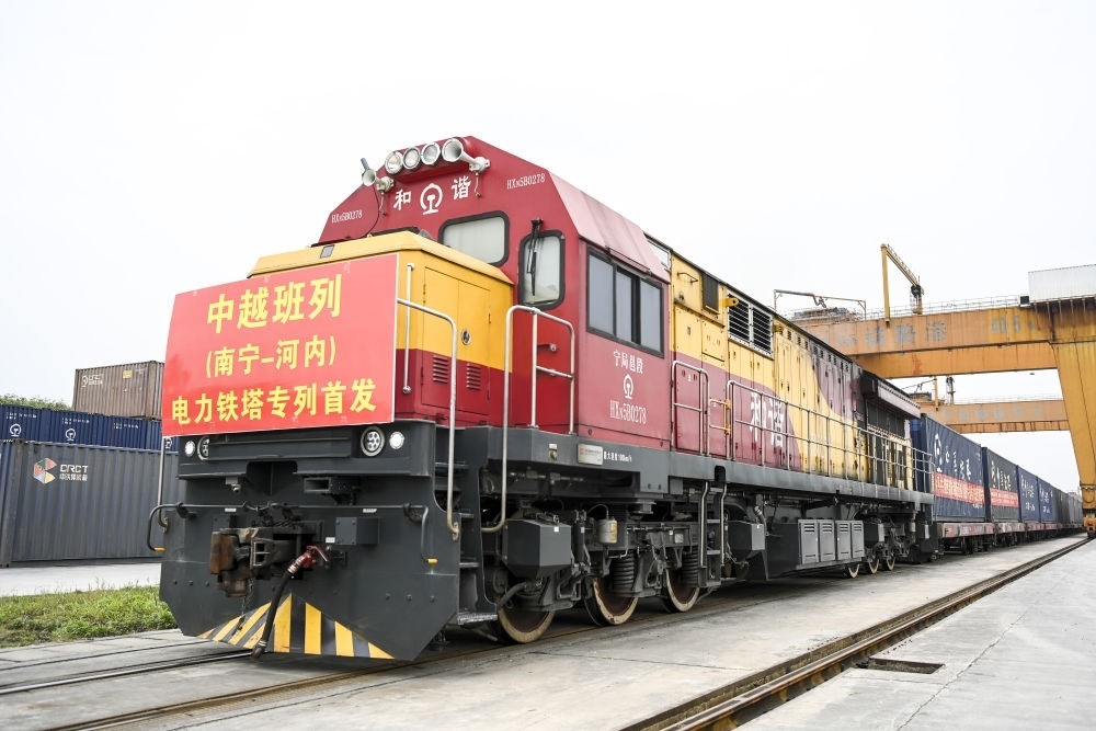 2024年3月8日,在南寧國(guó)際鐵路港,一列中越班列準(zhǔn)備發(fā)往越南河內(nèi)。西部陸海新通道鐵海聯(lián)運(yùn)班列和中歐班列、中越班列、中老鐵路等相互銜接聯(lián)通,搭建起“多向延伸、海陸互聯(lián)”的運(yùn)輸服務(wù)網(wǎng)絡(luò),中國(guó)西部地區(qū)面向東盟的國(guó)際大通道日趨通達(dá)。