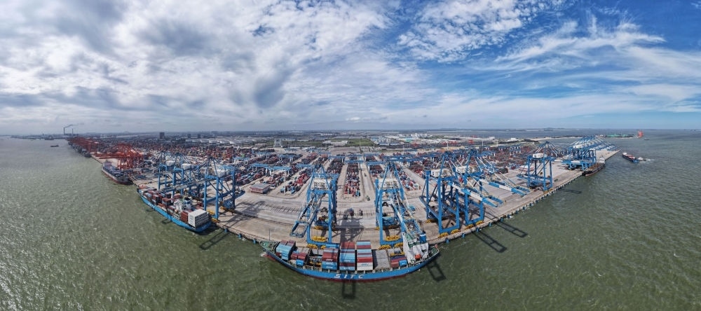 2024年6月13日,途經(jīng)馬來(lái)西亞關(guān)丹港的“海豐博多”輪在廣西欽州港集裝箱裝卸自動(dòng)化碼頭進(jìn)行裝卸作業(yè)(無(wú)人機(jī)全景照片)。