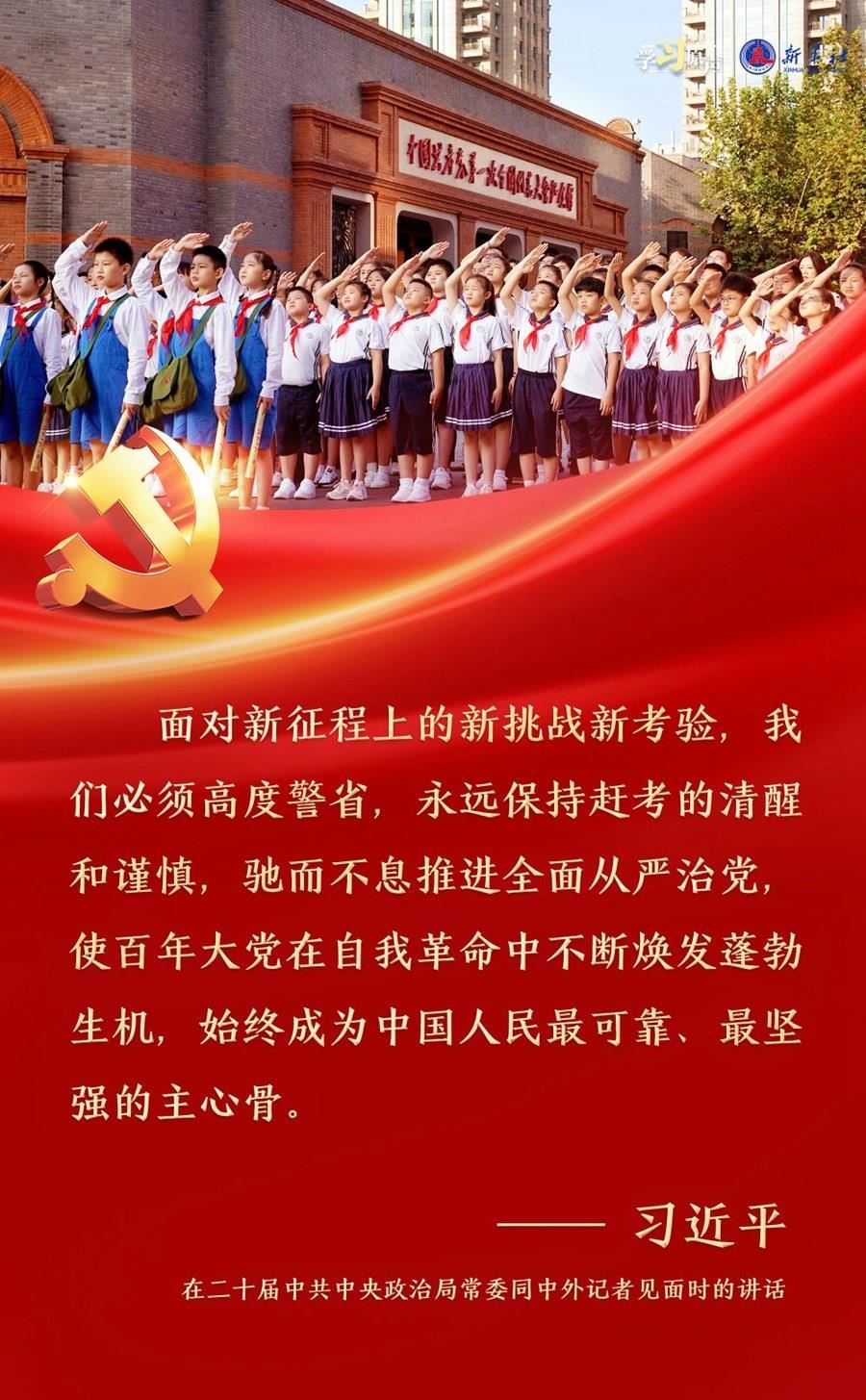 習(xí)近平總書記強調(diào),面對新征程上的新挑戰(zhàn)新考驗,我們必須高度警省,永遠保持趕考的清醒和謹慎,馳而不息推進全面從嚴治黨,使百年大黨在自我革命中不斷煥發(fā)蓬勃生機,始終成為中國人民最可靠、最堅強的主心骨。