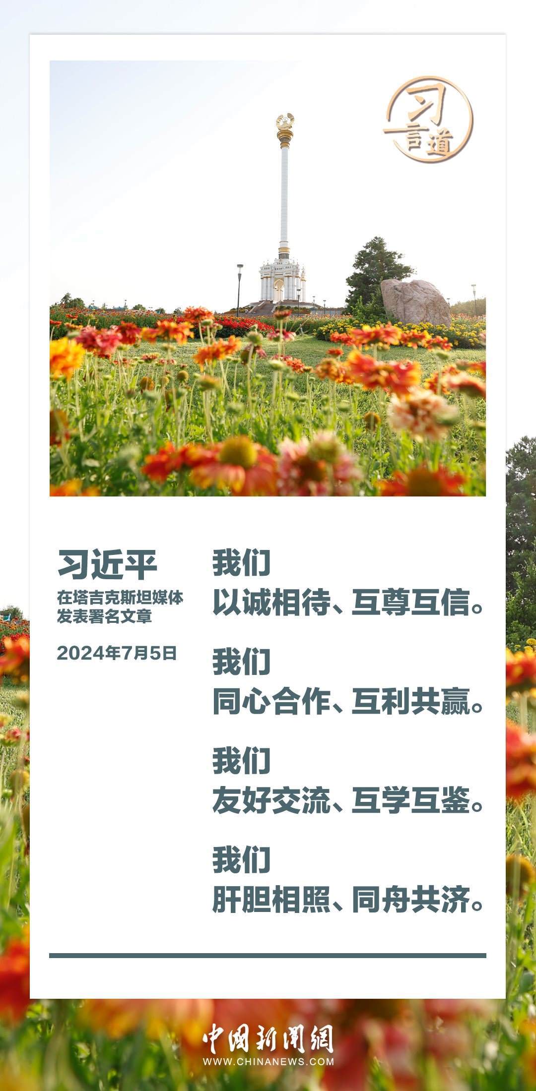 7月5日,在對(duì)塔吉克斯坦進(jìn)行國(guó)事訪問(wèn)之際,國(guó)家主席習(xí)近平在塔吉克斯坦《人民報(bào)》和“霍瓦爾”國(guó)家通訊社發(fā)表題為《共創(chuàng)中塔關(guān)系美好明天》的署名文章。習(xí)近平指出——