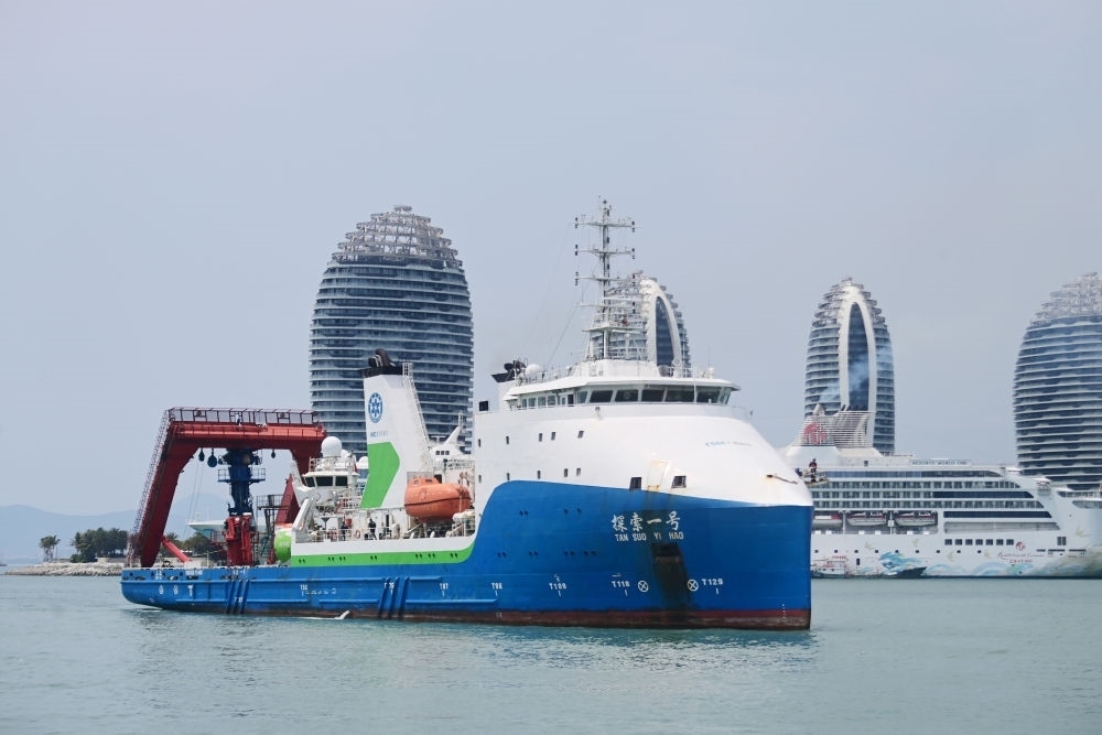 “探索一號(hào)”科考船搭載“奮斗者”號(hào)全海深載人潛水器返回海南三亞(2024年3月28日攝)。此次科考?xì)v時(shí)50天,順利完成中國-印度尼西亞爪哇海溝聯(lián)合深潛任務(wù)。新華社發(fā)(沙曉峰 攝)
