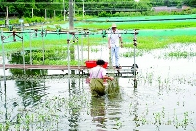 上海海洋大學師生在蟹塘檢查“白玉蟹”蛻殼情況。新華社發(fā)