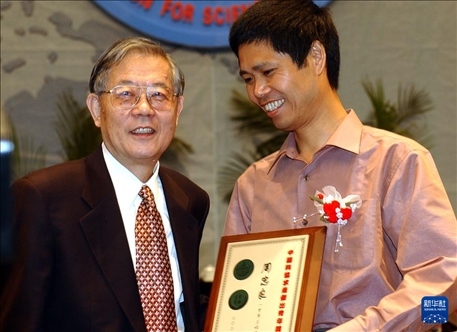 2003年9月13日,在中國科學(xué)技術(shù)協(xié)會2003年學(xué)術(shù)年會開幕式上,周光召同志為周忠良(右)等15人頒發(fā)中國科協(xié)“求是杰出青年獎(jiǎng)”。