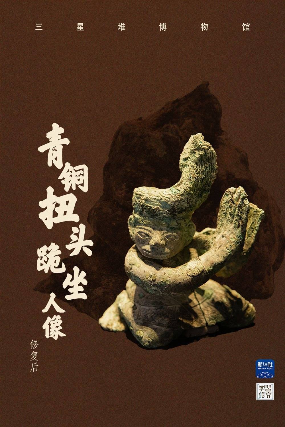 這是三星堆博物館文物保護與修復(fù)館拍攝的修復(fù)后的青銅扭頭跪坐人像。