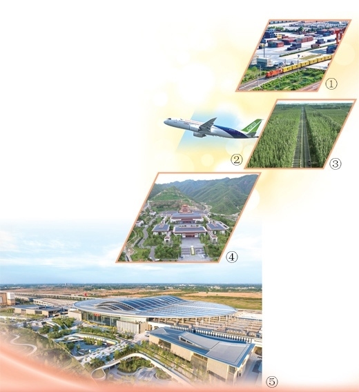 圖①:中歐班列從國鐵集團(tuán)鄭州局圃田車站駛出。國 徽攝(影像中國)圖②:國產(chǎn)大型客機(jī)C919。鄧智煒攝(新華社發(fā))圖③:新疆溫宿縣柯柯牙的“三北”防護(hù)林。新華社記者 李 響攝圖④:中國國家版本館中央總館。本報(bào)記者 陳 斌攝圖⑤:雄安站。宋 宇攝(影像中國)