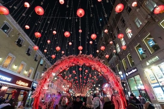 這是2月9日在俄羅斯首都莫斯科拍攝的掛滿中國新年主題裝飾的街道。當(dāng)日,“莫斯科的中國新年”文化活動(dòng)在俄羅斯首都莫斯科市中心啟動(dòng)。新華社記者 白雪騏 攝