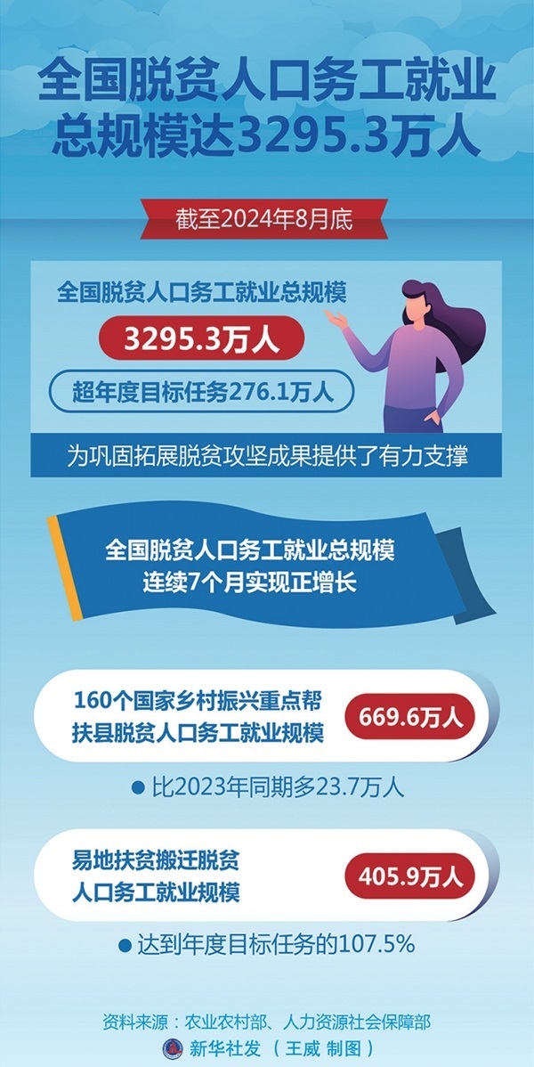 今年以來各級各相關(guān)部門深入開展防止返貧就業(yè)攻堅行動,截至8月底,全國脫貧人口務(wù)工就業(yè)總規(guī)模達到3295.3萬人,超年度目標(biāo)任務(wù)276.1萬人,為鞏固拓展脫貧攻堅成果提供了有力支撐。 新華社發(fā) 王威/制圖