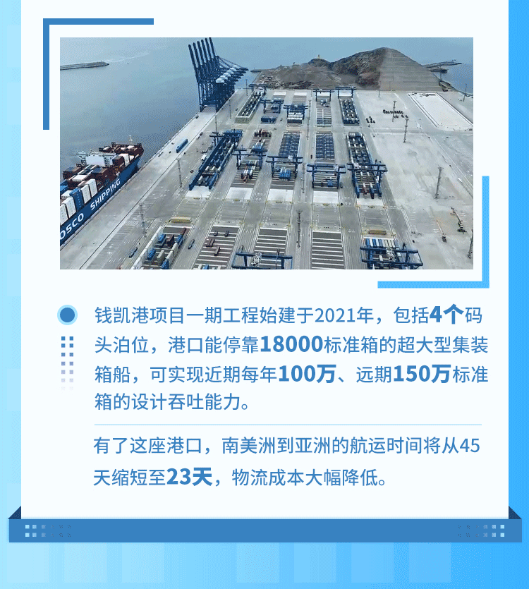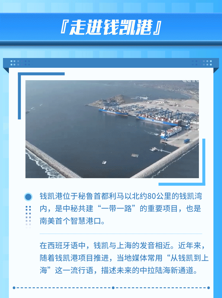 錢凱港位于秘魯首都利馬以北80公里,是中秘共建“一帶一路”重點項目。開港后,中秘間單程海運時間將縮短至23天,節(jié)約20%以上的物流成本,每年將為秘魯創(chuàng)造逾8000個直接就業(yè)機(jī)會。