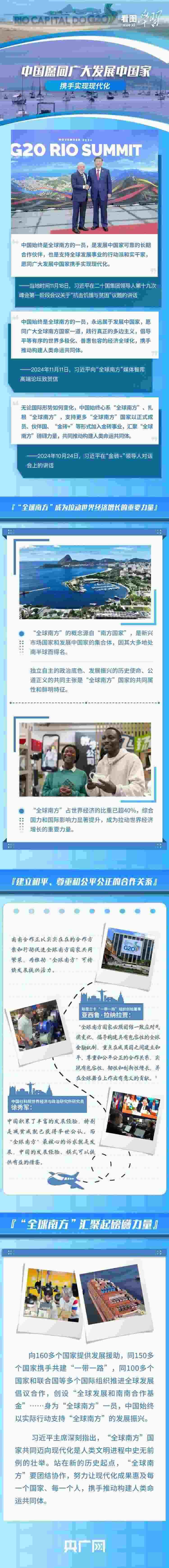 當(dāng)?shù)貢r(shí)間11月18日,習(xí)近平主席在G20峰會第一階段會議就“抗擊饑餓與貧困”議題發(fā)表重要講話,呼吁作為世界主要大國領(lǐng)導(dǎo)人應(yīng)該秉持命運(yùn)共同體意識,扛起歷史責(zé)任、展現(xiàn)歷史主動、推動歷史進(jìn)步。習(xí)主席表示,中國始終是“全球南方”的一員,是發(fā)展中國家可靠的長期合作伙伴,并宣布中國支持全球發(fā)展的八項(xiàng)行動,愿同各方一道行動,建設(shè)一個(gè)共同發(fā)展的公正世界。