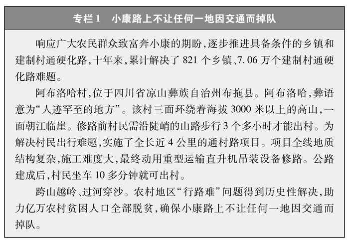 通達深度全面提升。實現(xiàn)了具備條件的約3萬個鄉(xiāng)鎮(zhèn)、超過50萬個建制村全部通硬化路(專欄1)。有序?qū)嵤┝溯^大人口規(guī)模自然村(組)通硬化路建設(shè)。旅游景點、產(chǎn)業(yè)園區(qū)、資源礦產(chǎn)等農(nóng)村地區(qū)主要經(jīng)濟節(jié)點的通硬化路問題基本解決。偏遠地區(qū)尤其是山區(qū)農(nóng)民群眾對外出行更加便捷。