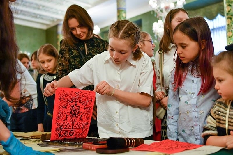 2023年6月2日,在位于俄羅斯莫斯科的中國(guó)駐俄羅斯大使館舉行的一場(chǎng)中國(guó)傳統(tǒng)文化體驗(yàn)活動(dòng)上,一名小朋友體驗(yàn)雕版印刷。