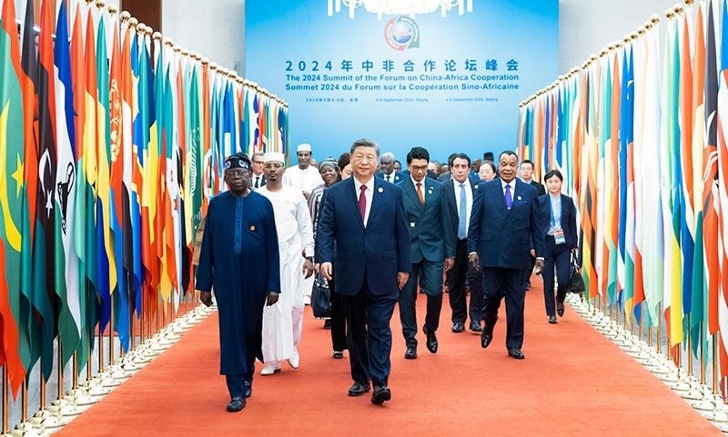 2024年9月5日,習(xí)近平主席在北京人民大會(huì)堂出席中非合作論壇北京峰會(huì)開(kāi)幕式并發(fā)表主旨講話。這是習(xí)主席同外方領(lǐng)導(dǎo)人共同步入會(huì)場(chǎng)。