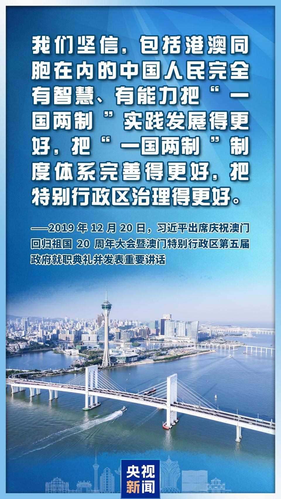 11月1日,在會見澳門特別行政區(qū)候任行政長官岑浩輝時,習(xí)近平主席指出,中央將繼續(xù)全面準(zhǔn)確、堅定不移貫徹“一國兩制”、“澳人治澳”、高度自治的方針,確保不會變、不走樣。