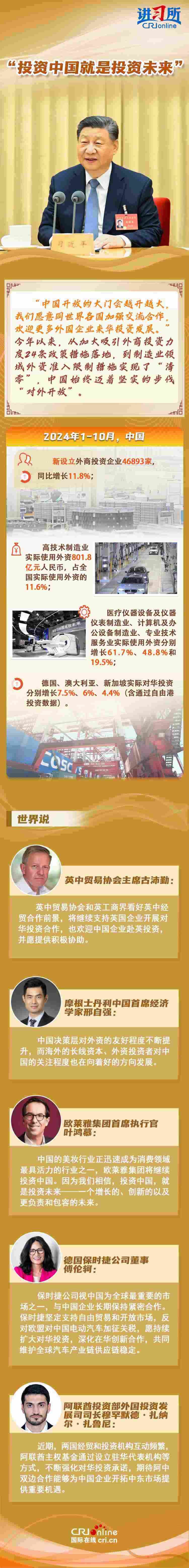 “中國是實干家、行動派。”今年以來,從習(xí)近平主席的歐洲之行到拉美之行,再到四天前在北京會見主要國際經(jīng)濟(jì)組織負(fù)責(zé)人,習(xí)近平一直強調(diào),中國的發(fā)展將給世界帶來巨大機(jī)遇。據(jù)聯(lián)合國貿(mào)易和發(fā)展會議不久前發(fā)布的《世界投資報告2024》中文版顯示,中國吸引外資的結(jié)構(gòu)不斷優(yōu)化、質(zhì)量不斷提高,多位政商界人士也認(rèn)為中國是一個非常有前景的市場,投資中國就是投資未來。