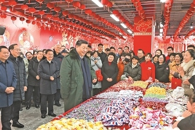 沈陽大東副食品商場歷史悠久,富有特色的年節(jié)商品琳瑯滿目。23日上午,習近平來到這里,察看多家店鋪,頻頻同店主和顧客交流,詳細了解節(jié)日期間市場供應情況。大家見到總書記都十分激動,連聲歡呼“總書記好”!習近平對大家說,“菜籃子”、“米袋子”、“果盤子”是民生大事,現(xiàn)在物質豐裕,過年團圓更要讓大家吃得好、吃得健康。