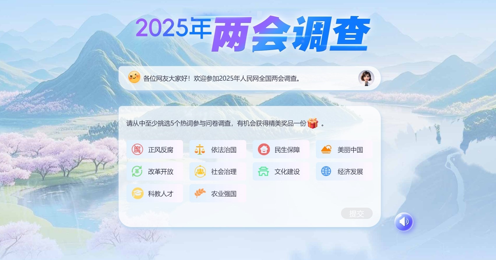 您期待哪些保障和改善民生領(lǐng)域的改革舉措落地?您認為提升社會治理水平應(yīng)重點改進哪些方面?全面推進依法治國的系列舉措您對哪些最為關(guān)注……2025年全國兩會召開期間,人民網(wǎng)記者將把調(diào)查結(jié)果和網(wǎng)友心聲帶給代表委員。