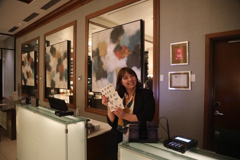 “請(qǐng)您稍等”“請(qǐng)聯(lián)系我”……在中國(guó)學(xué)生們?nèi)胱〉木频辏芭_(tái)工作人員謝伊·馬丁提前準(zhǔn)備了厚厚一疊中文指引卡片,讓很多第一次海外過(guò)年的中國(guó)小客人感到心里暖暖的。