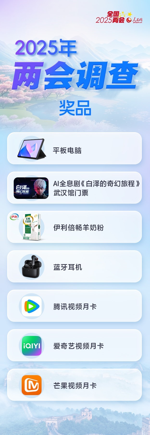 調查還在火熱進行,各界可繼續(xù)通過人民網(wǎng)全媒體通道參與本次調查。為感謝網(wǎng)友對人民網(wǎng)2025年全國兩會調查的支持,參與者有機會抽取精美獎品。