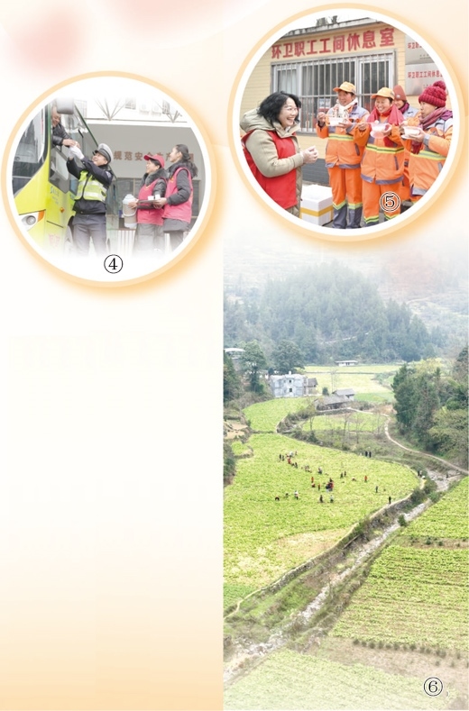 圖④:湖南懷化通道侗族自治縣,志愿者和交警為公交司機(jī)送上熱飲。