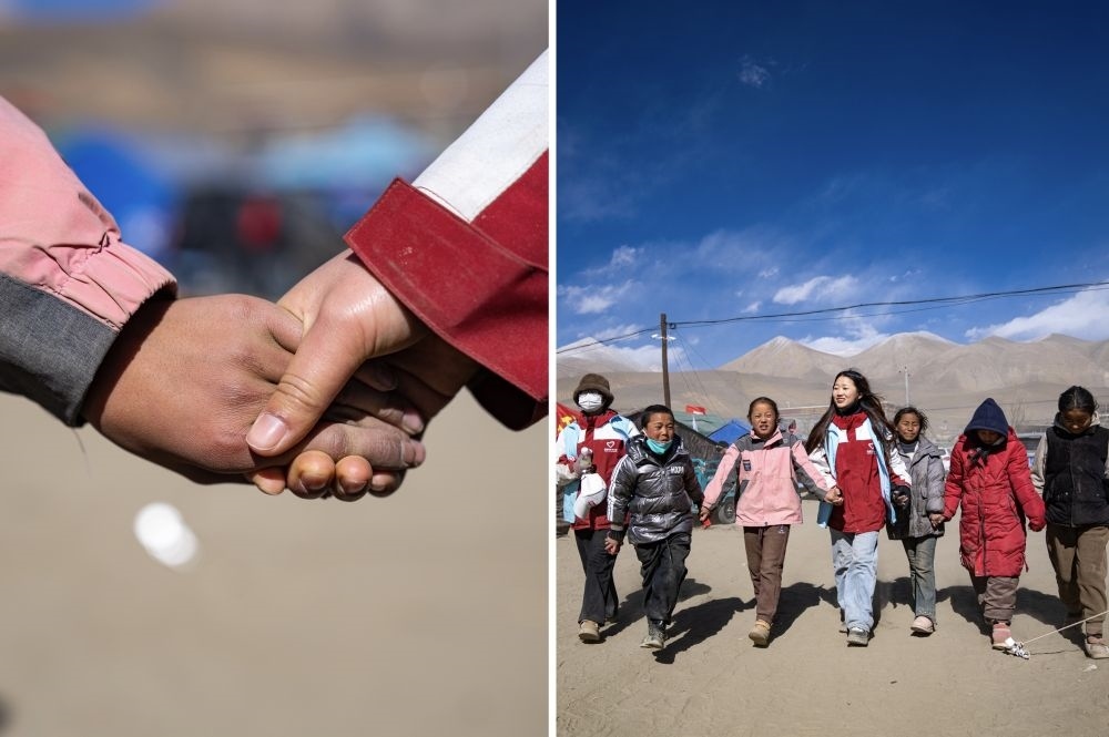 在西藏日喀則市定日縣長(zhǎng)所鄉(xiāng)森嘎村,西部計(jì)劃志愿者周漣笛和地震災(zāi)區(qū)孩子們?cè)谝黄穑瑤椭麄兪鑼?dǎo)心理(拼版照片,2025年1月13日攝)。新年伊始,一場(chǎng)突如其來的地震打破了高原的寧?kù)o。眾多志愿服務(wù)力量緊急奔赴,為受災(zāi)群眾帶來溫暖和力量。