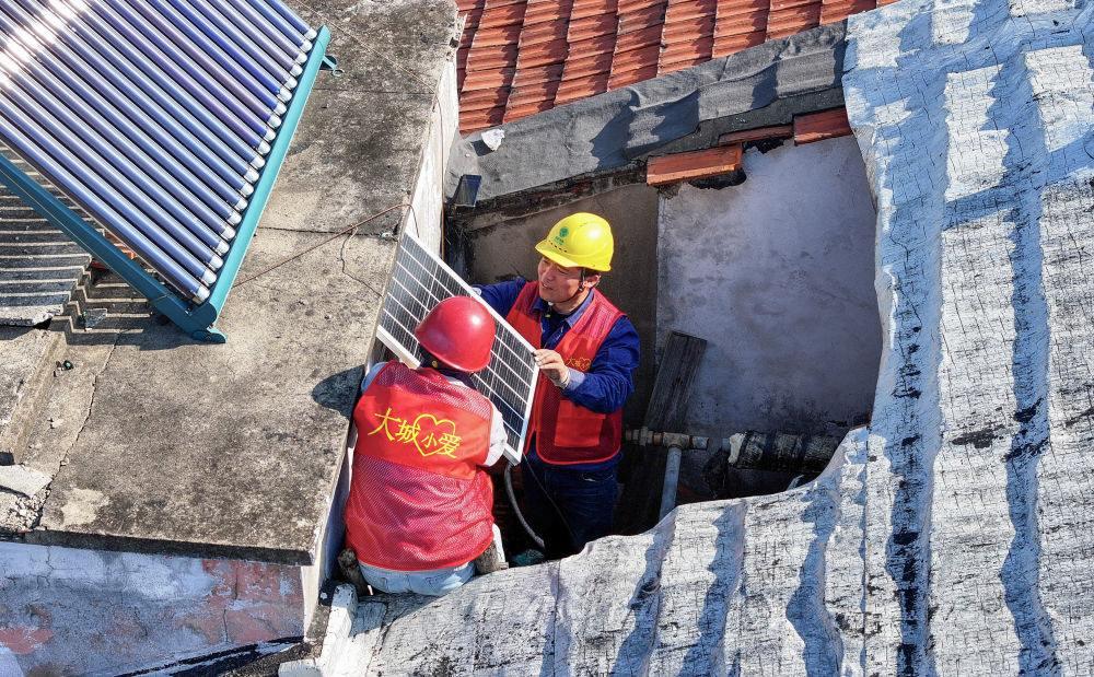 2025年3月2日,浙江余姚大城小愛公益服務(wù)中心志愿者在一老舊小區(qū)開展太陽(yáng)能照明公益改造,照亮老社區(qū)居民的回家路(無(wú)人機(jī)照片)。